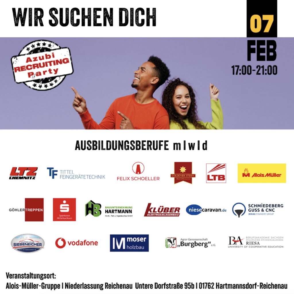 Bald geht es los mit deinem Abschlussjahr, und du bist noch auf der Suche nach dem perfekten Ausbildungsplatz? Dann komm am 07.02.2025 zu unserer AZUBIRECRUITINGPARTY nach Reichenau. Dich erwarten zahlreiche Unternehmen aus der Region – und natürlich auch wir.