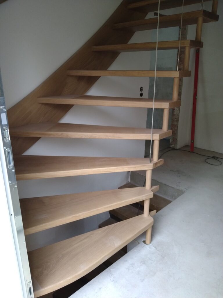 Um dem Stil des schon etwas älteren Hauses gerecht zu werden, entwarfen wir die Treppe mit geölter Eiche und einem Wandhandlauf aus demselben Material. Gepaart mit den Edelstahlseilen behält die Treppe damit ein älteres Flair und überzeugt gleichzeitig mit einer frischen Prise Modernität. Vor Ort wurde die alte Stufentreppe zunächst von uns entfernt und durch unseren neuen Entwurf ersetzt. Um ein einheitliches Gesamtbild im Treppenhaus zu erzeugen, entschied sich der Kunde, auch den an die Treppe angrenzenden Boden in beiden Geschossen neu zu verlegen. Wir boten ihm an, diese Aufgabe für ihn zu übernehmen, um das gleiche Material zu verwenden und damit eine Stimmigkeit von Treppe und Boden zu schaffen.