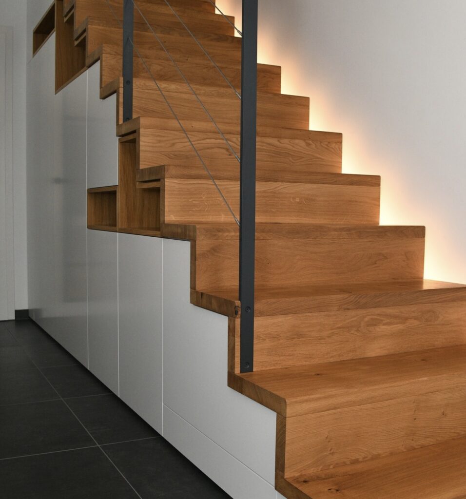 Die Möglichkeiten sind vielfältig: Wangentreppen mit zeitloser Ausstrahlung, filigrane Bolzentreppen für moderne Wohnräume, Podesttreppen für mehr Komfort oder Raumspartreppen für clevere Lösungen auf kleinem Raum. Und bei Göhler Treppen denken wir noch einen Schritt weiter – mit maßgeschneiderten Einbaulösungen, die Ihre Treppe zum multifunktionalen Möbelstück machen.