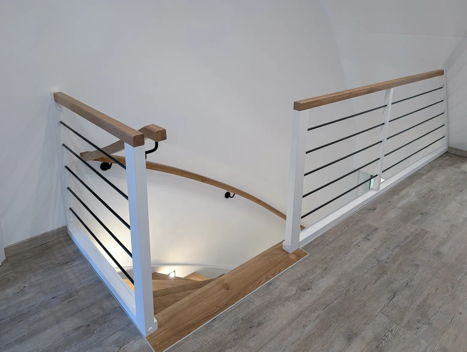 Diese elegante Treppenanlage verbindet die zeitlose Ausstrahlung von massivem Eichenholz mit modernen Gestaltungselementen. Die warmen Eichenstufen harmonieren perfekt mit den weiß lackierten Wangen und dem filigranen Relinggeländer aus pulverbeschichteten Stäben. Für zusätzlichen Komfort und Sicherheit sorgen in die Wangen integrierte LED-Spots, die jede Stufe sanft ausleuchten.