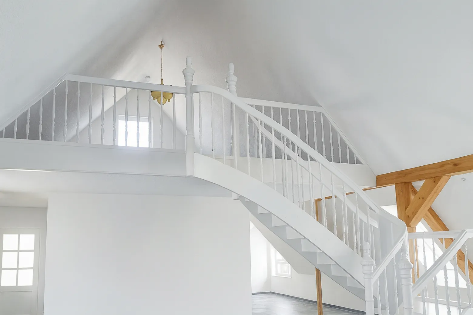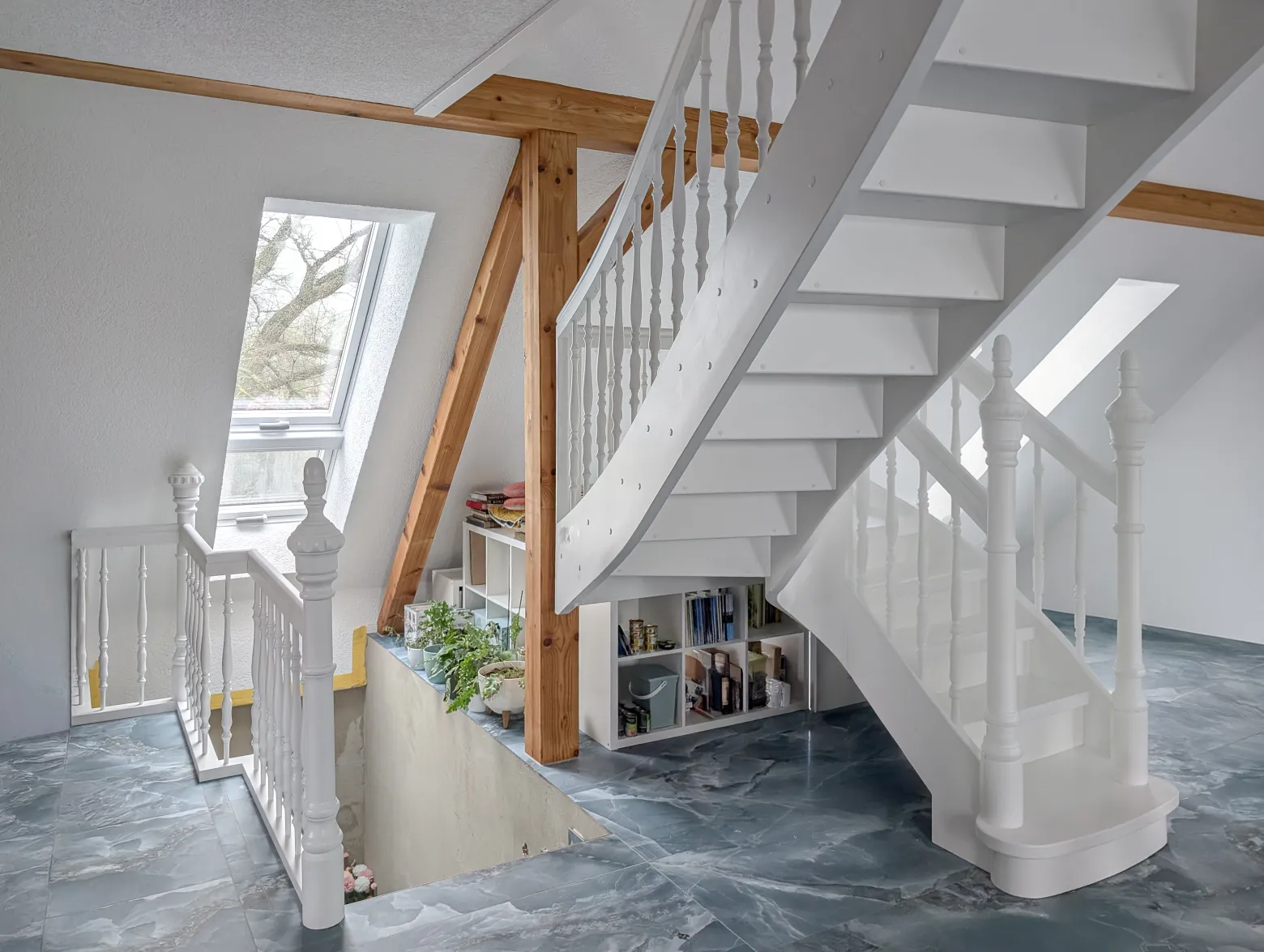 Diese Podesttreppe aus weiß lackierter Fichte verbindet handwerkliche Präzision mit kunstvoller Gestaltung. Die filigranen Zierstäbe und Säulen im Jugendstil verleihen ihr einen Hauch von Historie, ohne die großzügige Raumwirkung zu beeinträchtigen. Durch eine sorgfältige Entwurfsplanung und gestalterische Abstimmung entstand ein harmonisches Ensemble, das den Aufgang leicht und zugleich repräsentativ wirken lässt – ein echtes Statement für klassische Eleganz in modernem Ambiente.
